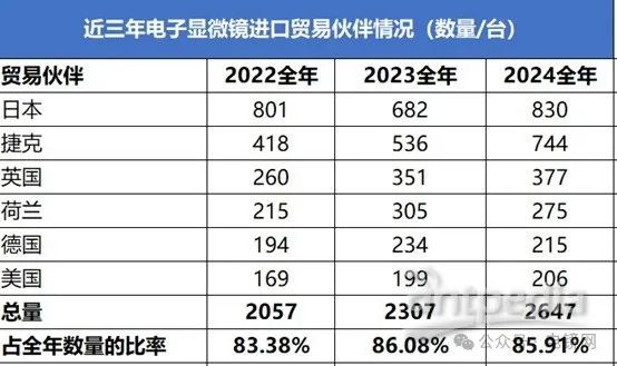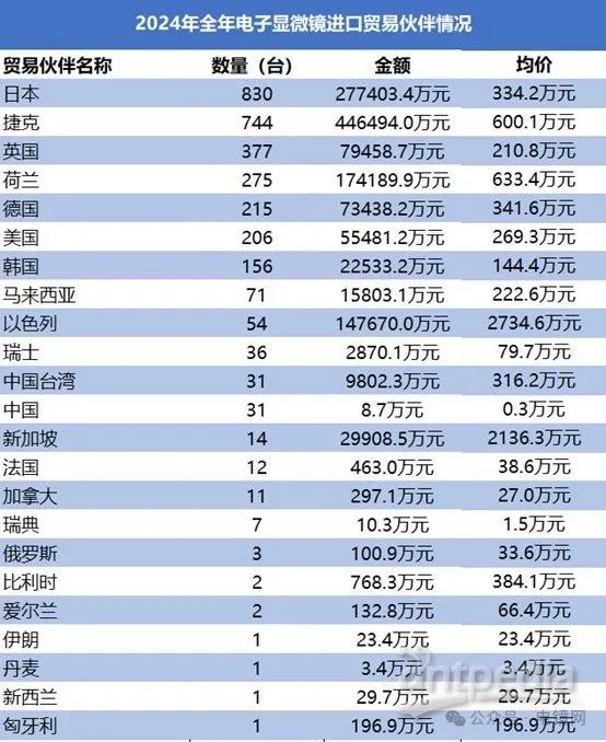 2024年我國電子顯微鏡的主要進(jìn)口來源國包括日本、捷克、英國、荷蘭、德國、美國、韓國等。日本以830臺進(jìn)口量居首,總進(jìn)口金額27.7億元,金額占比20.7%,均價334萬元/臺,其產(chǎn)品廣泛應(yīng)用于高校和科研機(jī)構(gòu),如日立、JEOL等品牌的市場認(rèn)可度較高。捷克進(jìn)口量從2022年的418臺增至2024年的744臺,金額占比33.4%(446.5億元),均價600萬元/臺,捷克是賽默飛(FEI)和泰思肯電鏡的主要產(chǎn)地。英國、荷蘭、德國、美國的2024年全年進(jìn)口量均超過200臺,分別為377臺、275臺、215臺和206臺。以色列和新加坡的進(jìn)口量雖然很少,但單價分別高達(dá)2730萬元/臺和2136萬元/臺。