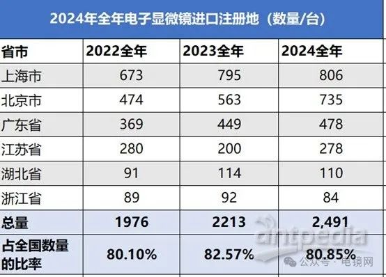 近三年來,上海市、北京市、廣東省、江蘇省、湖北省和浙江省是主要的電子顯微鏡進(jìn)口地區(qū)。上海市進(jìn)口量最多,2024年進(jìn)口806臺;北京市和廣東省穩(wěn)定增長,江蘇省呈現(xiàn)先增后降趨勢。整體顯示了不同地區(qū)的市場需求和發(fā)展趨勢。