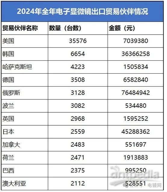 2024年全年,我國電子顯微鏡出口總數(shù)量為83169臺,出口金額為2.44億元。美國遙遙領(lǐng)先,出口臺數(shù)遠(yuǎn)超其他國家,還有韓國、哈薩克斯坦、德國、俄羅斯分別占據(jù)前五市場。金額上,俄羅斯優(yōu)勢明顯,出口金額為7649萬,幾乎是第二名韓國的兩倍。
