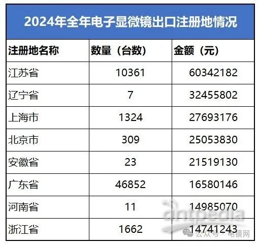 2024年全年,我國電子顯微鏡出口注冊地主要集中在江蘇省、廣東省、上海市等地。其中,廣東省以46852臺的出口數(shù)量位居首位,顯示出其在電子顯微鏡出口領(lǐng)域的強(qiáng)勁實(shí)力。江蘇省緊隨其后,出口數(shù)量達(dá)到10361臺,位居第二。