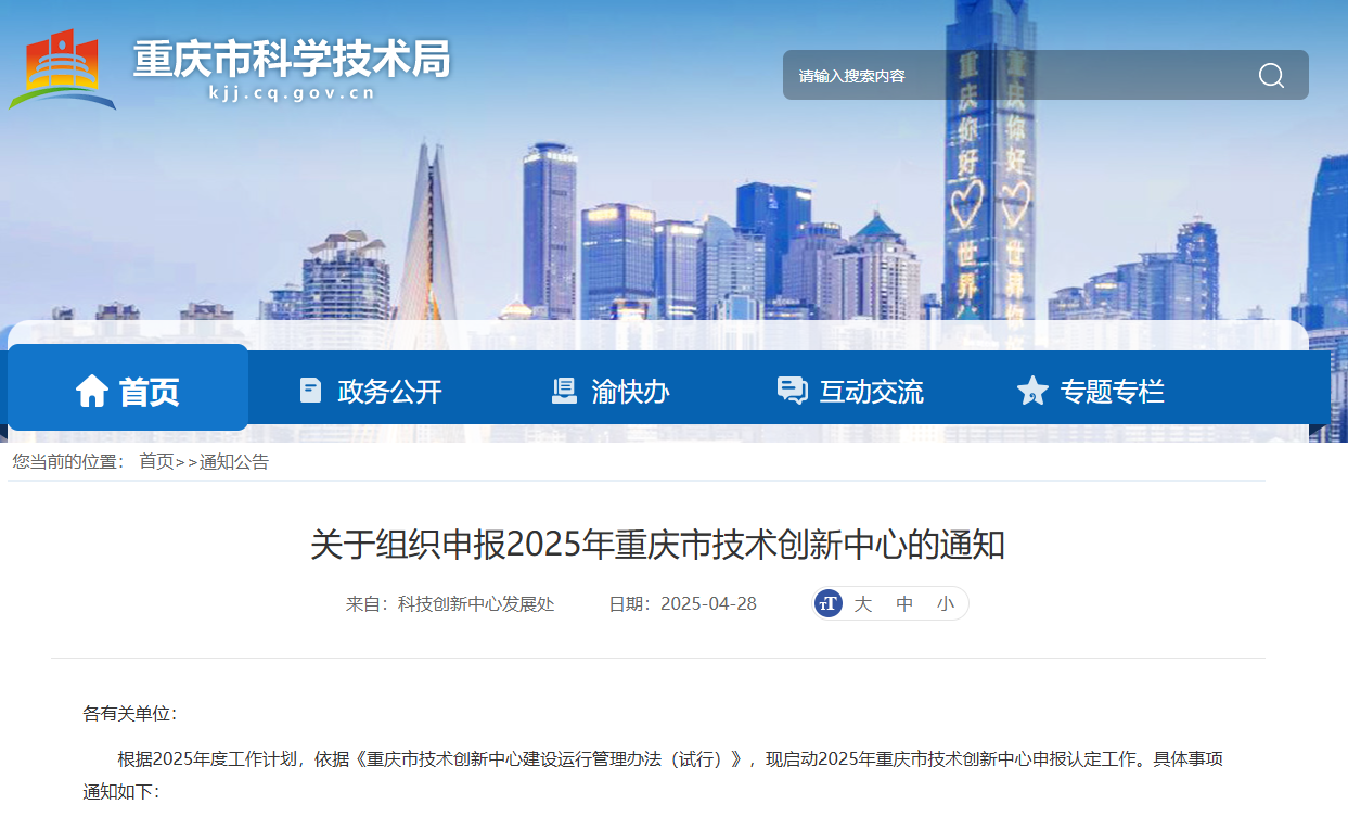 根據2025年度工作計劃,依據《重慶市技術創新中心建設運行管理辦法(試行)》,現啟動2025年重慶市技術創新中心申報認定工作。具體事項通知如下: