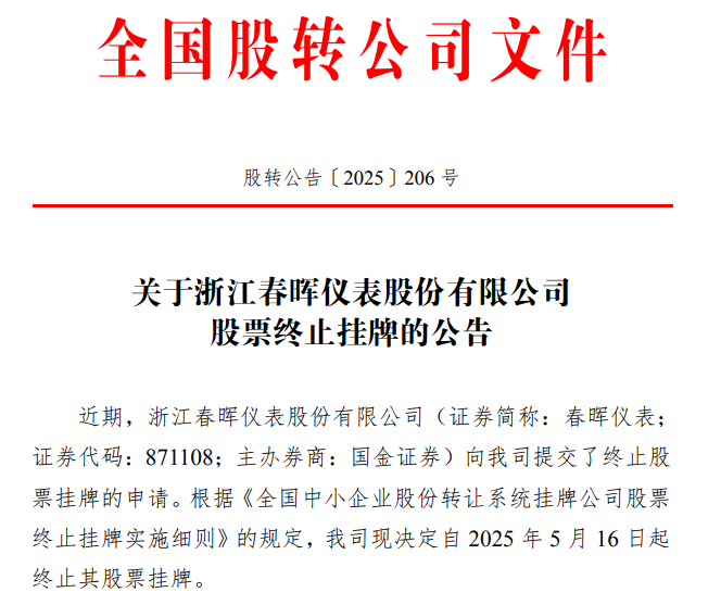 2025 年 5 月 13 日,全國中小企業(yè)股份轉(zhuǎn)讓系統(tǒng)有限責(zé)任公司發(fā)布股轉(zhuǎn)公告〔2025〕206 號(hào),宣布浙江春暉儀表股份有限公司(證券簡(jiǎn)稱:春暉儀表)向其提交了終止股票掛牌的申請(qǐng)。依據(jù)《全國中小企業(yè)股份轉(zhuǎn)讓系統(tǒng)掛牌公司股票終止掛牌實(shí)施細(xì)則》規(guī)定,全國股轉(zhuǎn)公司決定自 2025 年 5 月 16 日起終止春暉儀表股票掛牌。