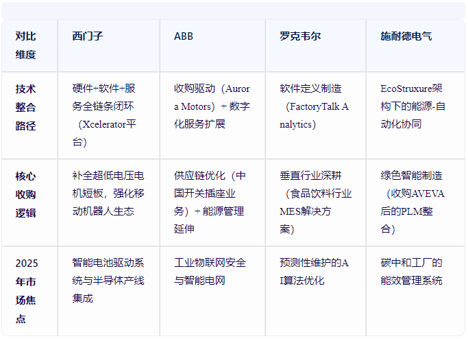 全球工控巨頭的戰(zhàn)略分野:西門子VS競爭對手在工業(yè)自動化領域,西門子、ABB、羅克韋爾、施耐德電氣正形成差異化競爭格局: