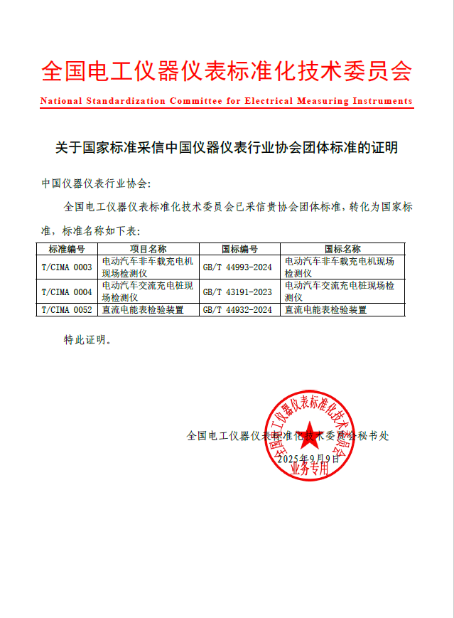 9月,全國電工儀器儀表標(biāo)準(zhǔn)化技術(shù)委員會(huì)給協(xié)會(huì)發(fā)來證明文件,協(xié)會(huì)的3項(xiàng)團(tuán)體標(biāo)準(zhǔn)已被國標(biāo)委采信,正式轉(zhuǎn)化為國家標(biāo)準(zhǔn)。
