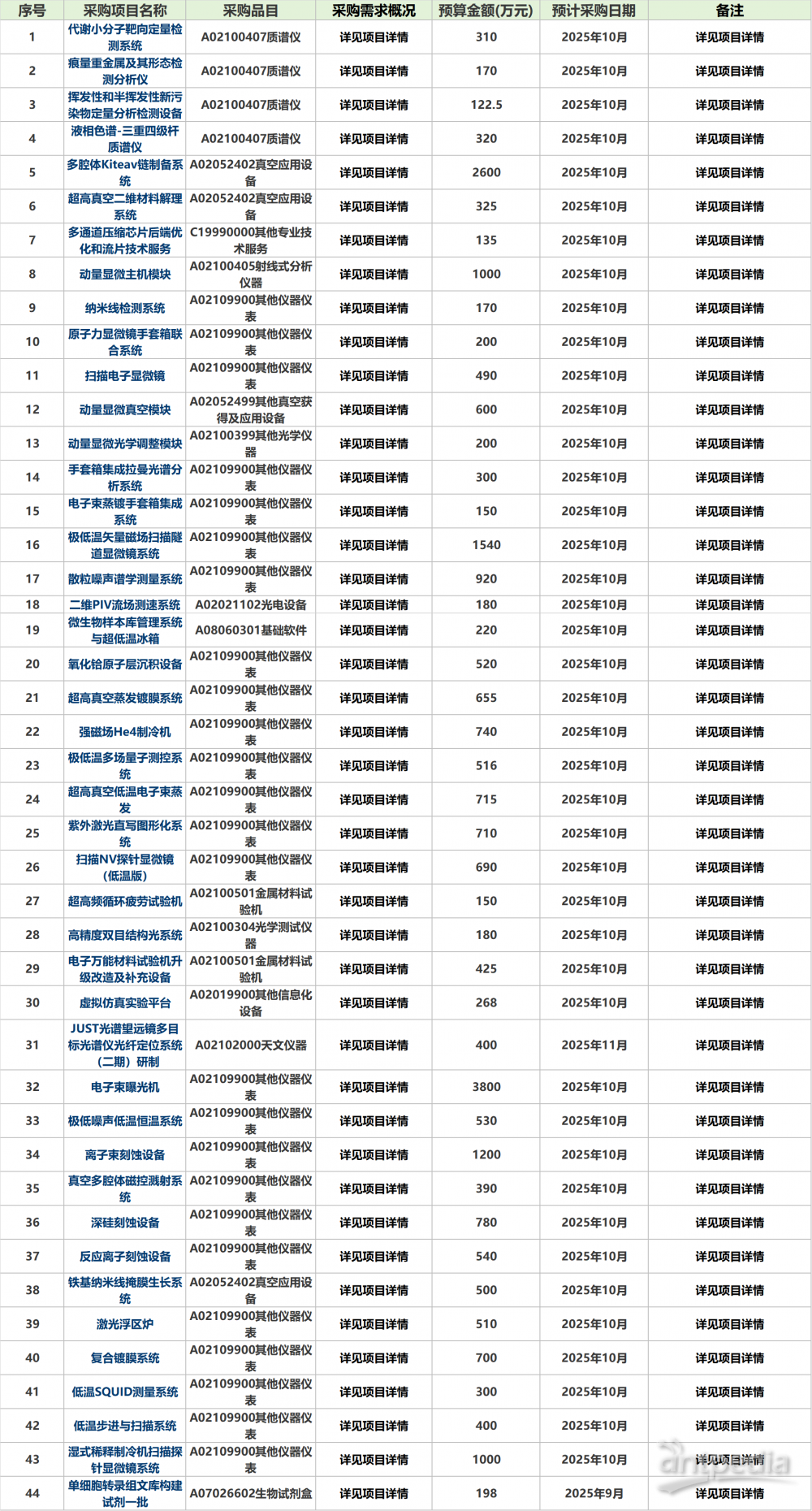 中國政府采購網(wǎng)消息,近日,上海交通大學(xué)連續(xù)發(fā)布2025年度9月、10月及11月政府采購意向。內(nèi)容顯示,該批次采購意向采購標(biāo)的涵蓋多類科研儀器設(shè)備及專業(yè)技術(shù)服務(wù),包括代謝小分子靶向定量檢測系統(tǒng)、液相色譜 -三重四級桿質(zhì)譜儀、極低溫矢量磁場掃描隧道顯微鏡系統(tǒng)等。公開信息顯示,該批次采購預(yù)算總金額達到2.67億元,采購日期方面,除“單細胞轉(zhuǎn)錄組文庫構(gòu)建試劑一批”及“JUST光譜望遠鏡多目標(biāo)光譜儀光纖定位系統(tǒng)(二期)研制”將于9月和11月采購之外,其余項目均將于10月份進行采購。具體信息已項目相關(guān)采購公告和采購文件為準(zhǔn)。