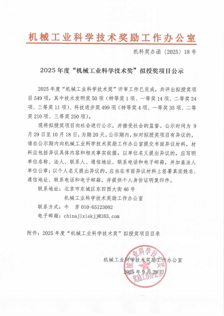 2025年度“機(jī)械工業(yè)科學(xué)技術(shù)獎(jiǎng)”評(píng)審工作已完成,共評(píng)出擬授獎(jiǎng)項(xiàng)目549項(xiàng),其中技術(shù)發(fā)明獎(jiǎng)50項(xiàng)(特等獎(jiǎng)1項(xiàng)、一等獎(jiǎng)14項(xiàng)、二等獎(jiǎng)24項(xiàng)、三等獎(jiǎng)11項(xiàng))、科技進(jìn)步獎(jiǎng)499項(xiàng)(特等獎(jiǎng)4項(xiàng)、一等獎(jiǎng)35項(xiàng)、二等獎(jiǎng)210項(xiàng)、三等獎(jiǎng)250項(xiàng))。