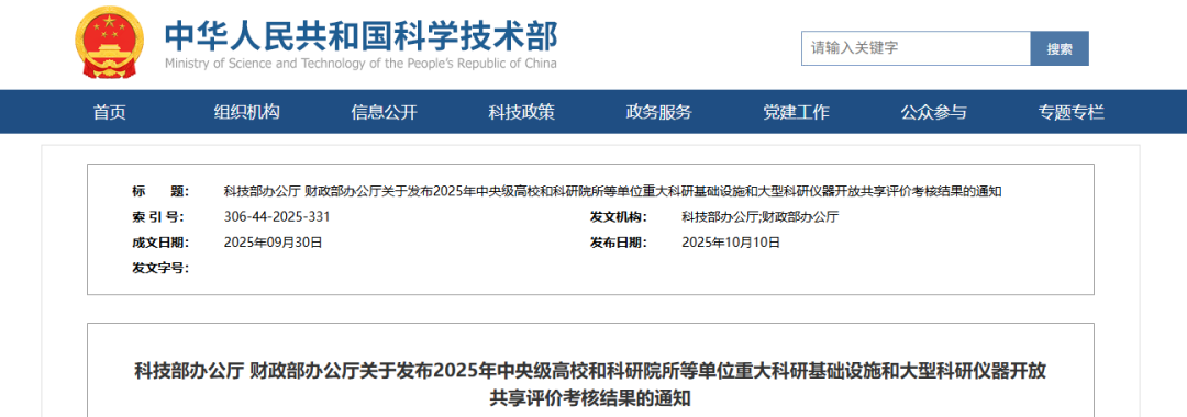 10月10日,科技部辦公廳、財(cái)政部辦公廳發(fā)布了《關(guān)于發(fā)布2025年中央級(jí)高校和科研院所等單位重大科研基礎(chǔ)設(shè)施和大型科研儀器開(kāi)放共享評(píng)價(jià)考核結(jié)果的通知》。