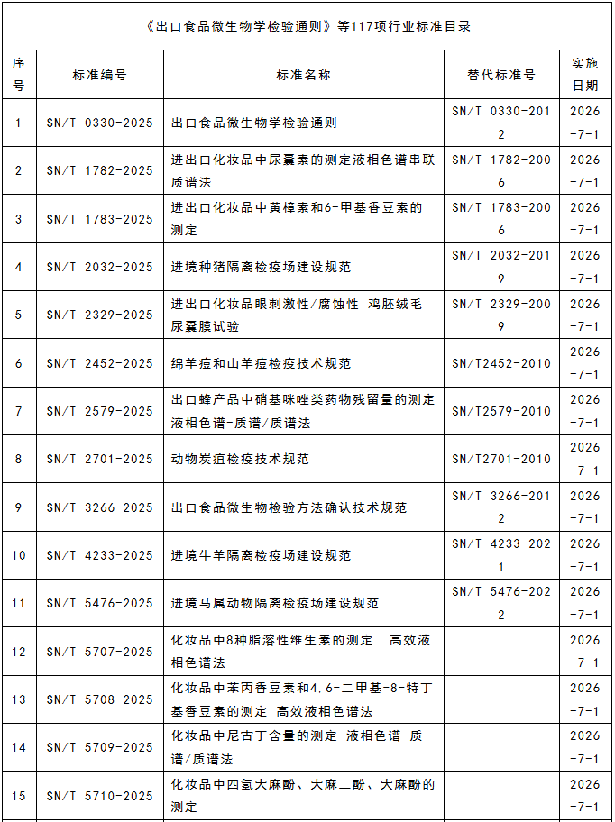 1211日,海關總署發布《出口食品微生物學檢驗通則》等117項行業標準。這些新發布的行業標準旨在進一步規范出口食品的檢驗流程,確保出口食品的質量與安全,提升我國食品在國際市場上的競爭力。