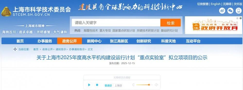 12月15日,上海市科技委員會網站公示上海市2025年度高水平機構建設運行計劃“重點實驗室”擬立項項目,共10項入選。