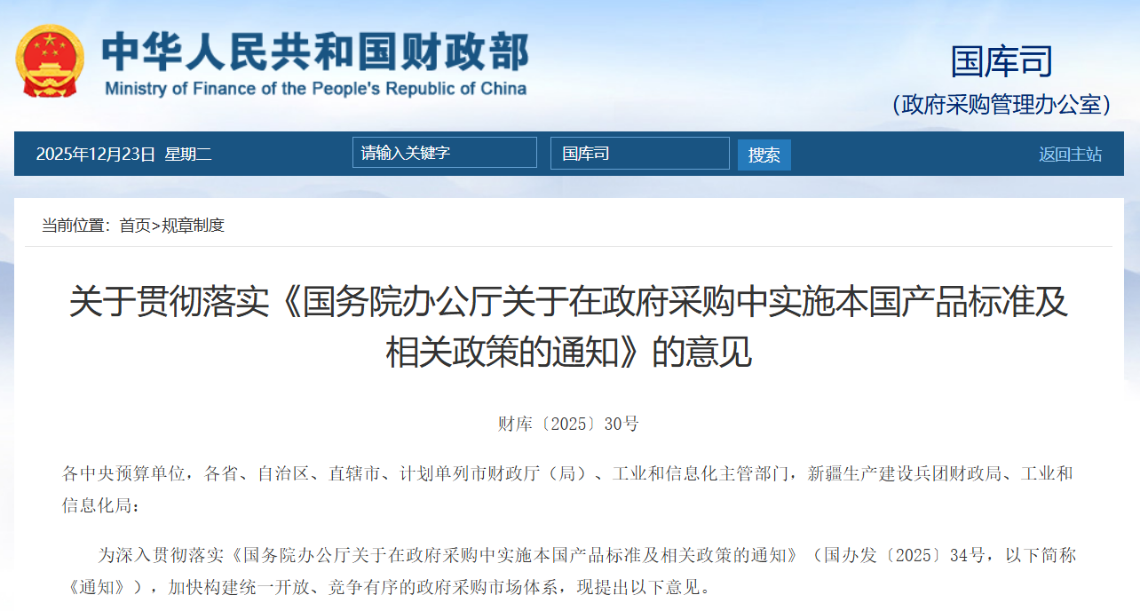 《通知》以習近平新時代中國特色社會主義思想為指導,全面貫徹黨的二十大和二十屆歷次全會精神,緊扣高質量發展要求,結合我國發展實際,對接國際高標準經貿規則,系統提出了構建政府采購中本國產品標準體系以及對本國產品予以支持的工作要求,為進一步保障各類經營主體平等參與政府采購活動提供了制度依據。