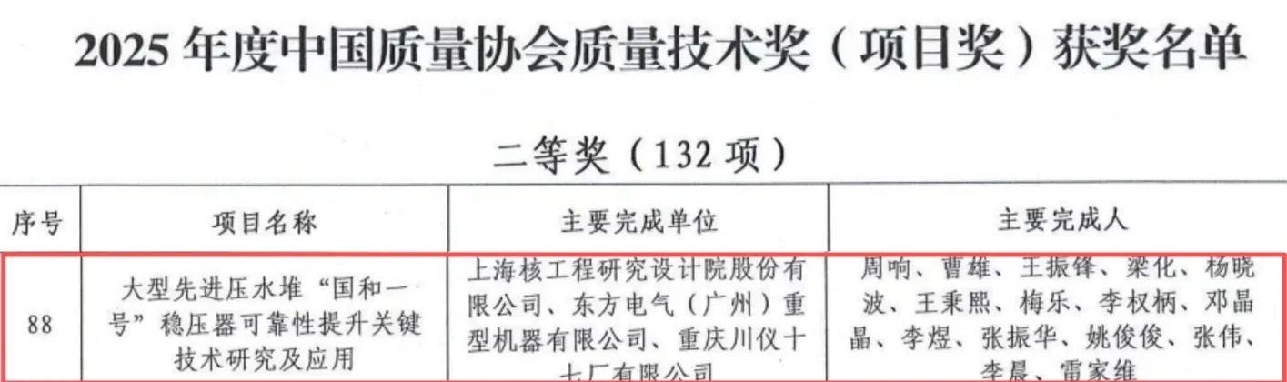 重慶川儀十七廠有限公司(以下簡稱“川儀十七廠”)與上海核工程研究設(shè)計(jì)院股份有限公司、東方電氣(廣州)重型機(jī)器有限公司聯(lián)合攻關(guān)的“大型先進(jìn)壓水堆‘國和一號’穩(wěn)壓器可靠性提升關(guān)鍵技術(shù)研究及應(yīng)用”項(xiàng)目,榮獲2025年中國質(zhì)量協(xié)會(huì)“質(zhì)量技術(shù)獎(jiǎng)”二等獎(jiǎng)。