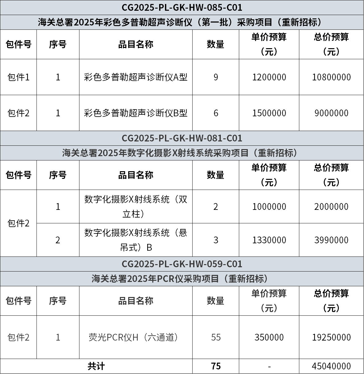 近日,海關(guān)總署物資裝備采購中心發(fā)布多則公告,分別就“海關(guān)總署2025年數(shù)字化攝影X射線系統(tǒng)采購項目(重新招標)”“海關(guān)總署2025年PCR儀采購項目(重新招標)”“海關(guān)總署2025年彩色多普勒超聲診斷儀(第一批)采購項目(重新招標)”進行國內(nèi)公開招標采購。