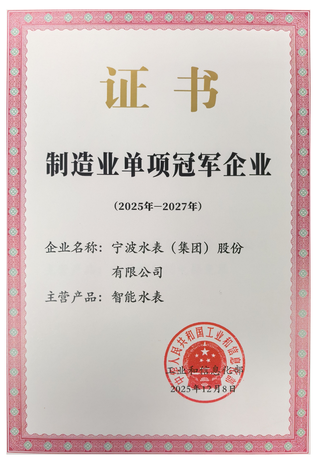 近日,工業(yè)和信息化部正式公布制造業(yè)單項冠軍企業(yè)復核通過名單,寧波水表(集團)股份有限公司(以下簡稱“寧水集團”)再次榮膺國家級制造業(yè)單項冠軍企業(yè)稱號,成為行業(yè)內(nèi)唯一蟬聯(lián)該國家級榮譽的標桿企業(yè)。此次復核成功,不僅是對寧水集團在智能水計量領(lǐng)域全球領(lǐng)先地位的權(quán)威認證,更是對企業(yè)構(gòu)建并持續(xù)深化技術(shù)、制造與品牌全方位核心競爭力的國家級認可。