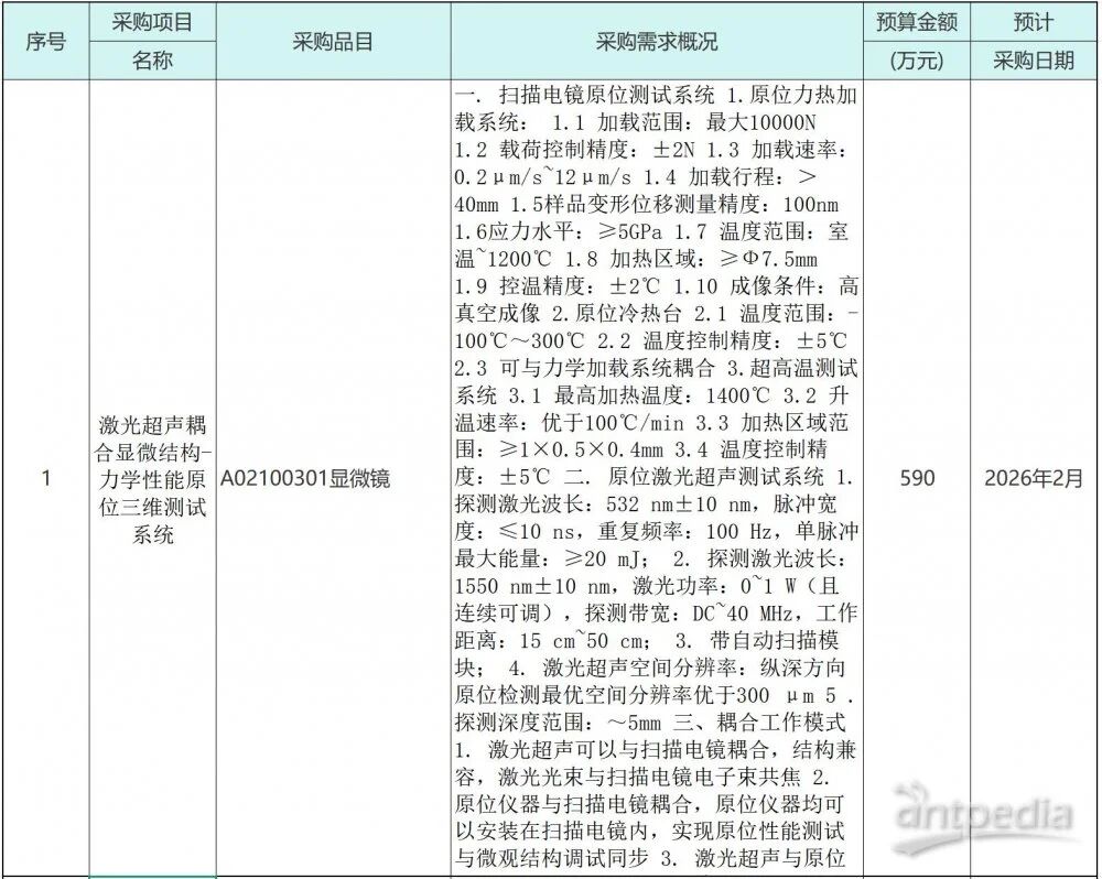 本次采購的“激光超聲耦合顯微結構-力學性能原位三維測試系統(tǒng)”技術集成度高、指標先進。該系統(tǒng)要求能夠與掃描電鏡深度耦合,在微觀尺度下(如掃描電鏡腔內(nèi))實現(xiàn)對材料在極端條件(如-100℃至1400℃溫度范圍、高達5GPa的應力水平)下的力學行為進行實時、原位觀測,并同步結合激光超聲技術進行亞表面缺陷與性能的無損檢測與三維成像。該系統(tǒng)的引入,將為新材料研發(fā)、微觀力學機制研究等前沿領域提供前所未有的“洞察力”。