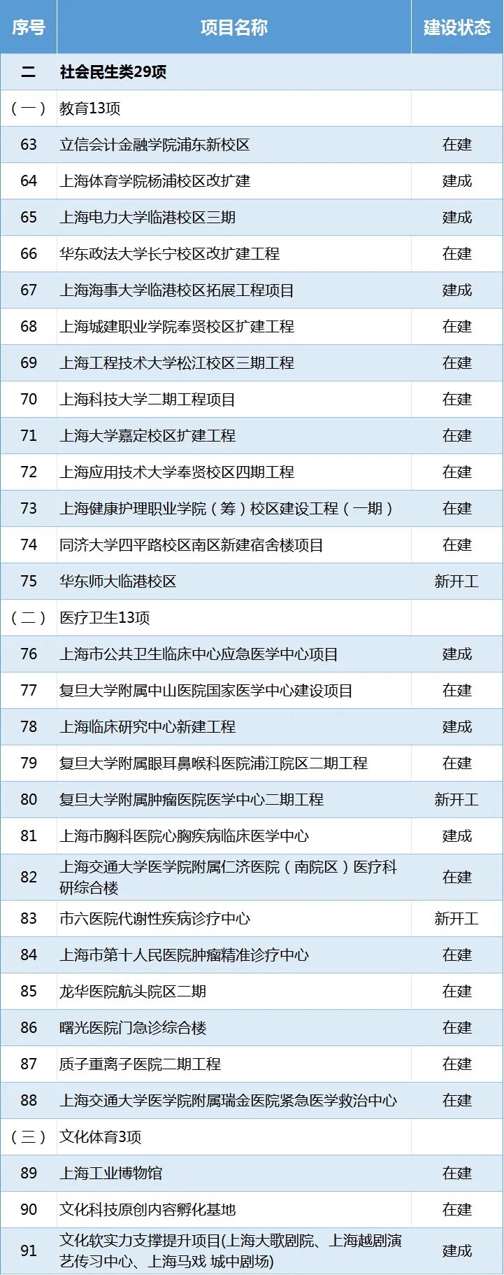 計劃建成7項:上海體育學院楊浦校區改擴建、上海電力大學臨港校區三期、上海海事大學臨港校區拓展工程項目、上海市公共衛生臨床中心應急醫學中心項目、上海臨床研究中心新建工程、上海市胸科醫院心胸疾病臨床醫學中心、文化軟實力支撐提升項目等。
