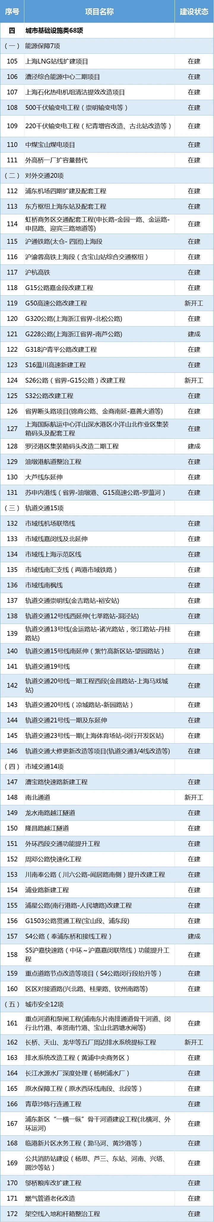 在建項目61項:上海LNG站線擴建、漕涇綜合能源中心二期、浦東機場四期擴建及配套工程、東方樞紐上海東站及配套工程、市域線嘉閔線及北延伸、漕寶路快速路、龍水南路越江隧道等。