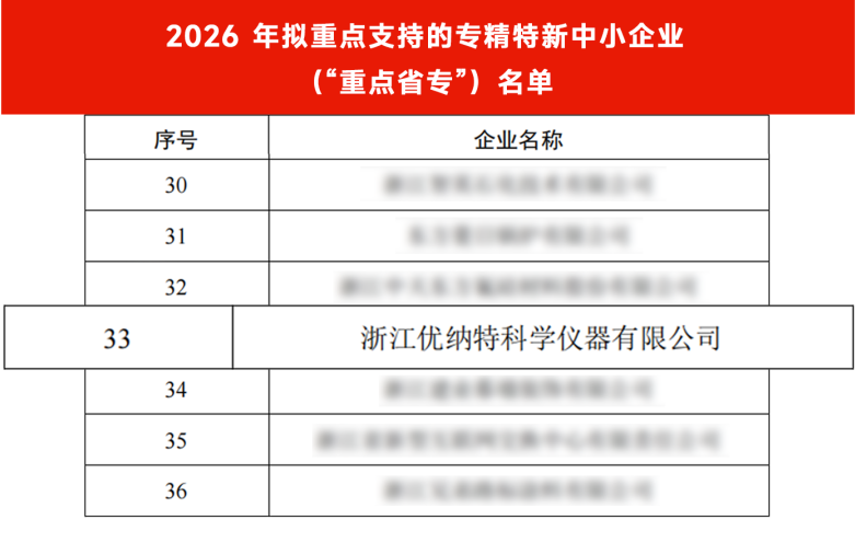 近日,浙江省經(jīng)濟(jì)和信息化廳公示了2026年擬重點(diǎn)支持的專(zhuān)精特新中小企業(yè)(“重點(diǎn)省專(zhuān)”)名單。400家企業(yè)實(shí)施融通入鏈“四提一強(qiáng)”推進(jìn)計(jì)劃。浙江優(yōu)納特科學(xué)儀器有限公司憑借雄厚的技術(shù)創(chuàng)新能力和市場(chǎng)影響力,成功入選。