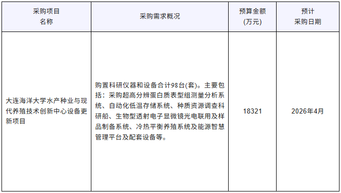 近期,大連海洋大學發布多項儀器采購意向,采購預算金額18321萬元,涉及儀器設備包括超高分辨蛋白質表型組測量分析系統、自動化低溫存儲系統、種質資源調查科研船、生物型透射電子顯微鏡光電聯用及樣品制備系統、冷熱平衡養殖系統及能源智慧管理平臺及配套設備等。預計采購時間20264月。