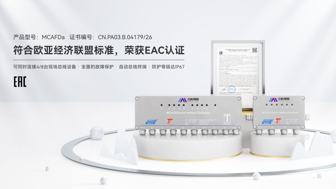 EAC認(rèn)證的獲得,不僅是對(duì)MCAFD系列產(chǎn)品性能與品質(zhì)的權(quán)威認(rèn)可,更是中科博微拓展國(guó)際市場(chǎng)的重要里程碑。未來,中科博微將持續(xù)深耕工業(yè)自動(dòng)化領(lǐng)域,以優(yōu)質(zhì)產(chǎn)品與核心技術(shù),穩(wěn)步開拓歐亞市場(chǎng),為全球客戶提供更可靠、高效的現(xiàn)場(chǎng)總線解決方案,助力工業(yè)領(lǐng)域高質(zhì)量發(fā)展。